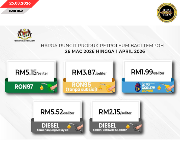 KUALA LUMPUR, 25 Mac – Opis Menteri Wang Malaysia madahka rega runchit produk petroleum ungkup timpuh 26 Mac ngagai 1 April 2026 bekaul rega petrol RON97 enggau RON95 mengkang enda berubah, lalu rega diesel ngayanka bida nitihka pelilih menua.