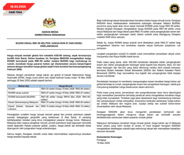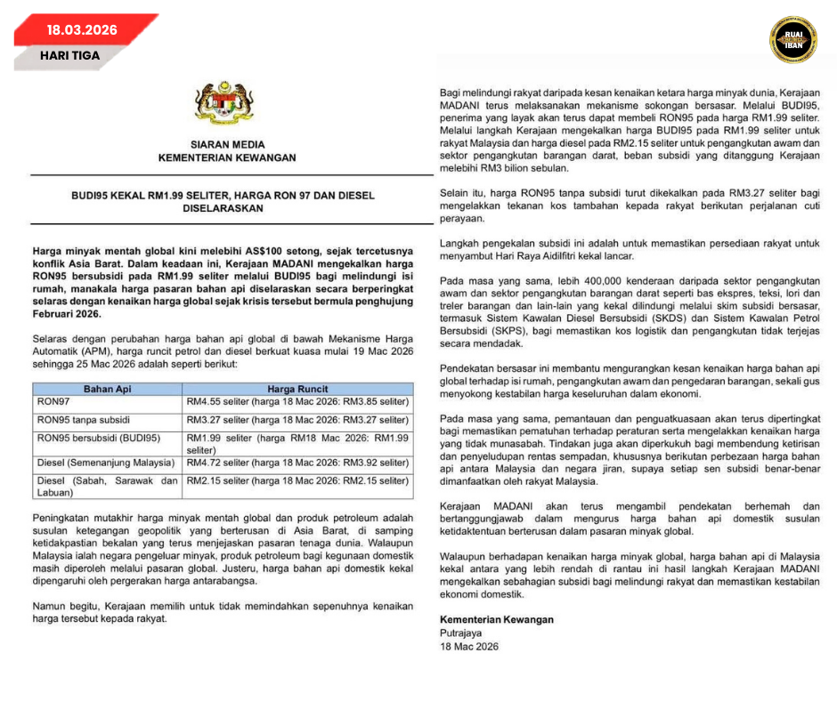 PUTRAJAYA, Mac 18 – Perintah ngetanka rega sabsidi minyak RON95 iya nya RM1.99 seliter nengah program BUDI95, taja pan rega minyak mata global diatu ngelui US$100 setong berindik ari penyarut geopolitik di Asia Barat.