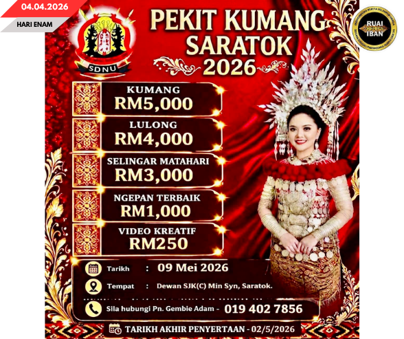 SARATOK, 4 April — Gerempung Bansa Dayak Sarawak (SDNU) enggau Sarakup Indu Dayak Sarawak (SIDS) Pampang Saratok deka ngatur pekit Pekit Kumang Saratok 2026 kena 9 Mei beserimbai enggau pengerami Hari Gawai Dayak ti deka datai.