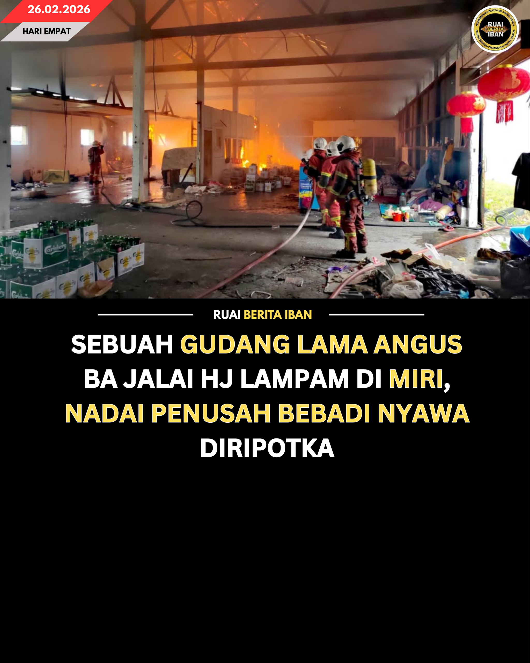 MIRI, 26 Feb — Sebuah gudang lama ke enda dikena agi ba Jalai Hj Lampam angus ba penusah ke nyadi tumu pagi tadi.
