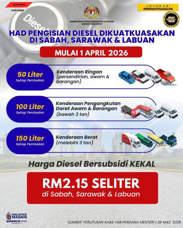 KUCHING, 28 Mac —Opis Menteri Dagang Dalam Menua enggau Kos Pengidup (KPDN) deka neritka tatak ngisi minyak diesel ungkup perengka pengangkut darat di Sabah, Sarawak enggau Wilayah Persekutuan Labuan berengkah 1 April 2026.