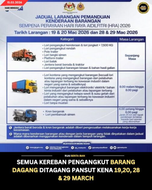 KUCHING, 15 MAC – Opis Perengka Pengangkut Darat (JPJ) Malaysia udah madahka notis tagang deriba perengka pengangkut barang beserimbai enggau pengerami Hari Raya Aidilfitri 2026 kena 19, 20, 28 enggau 29 Mac.