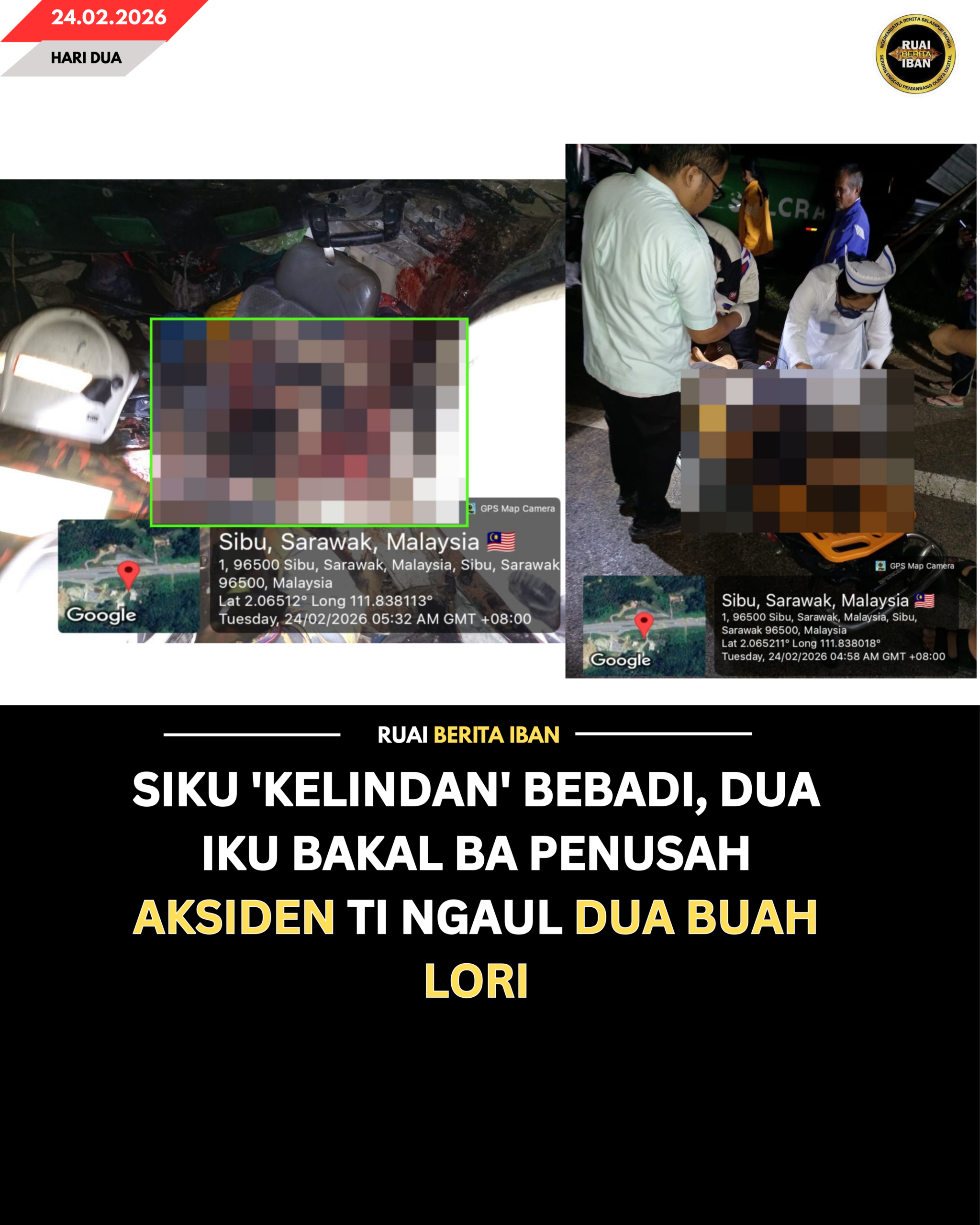 JULAU, 24 Feb — Siku ‘kelindan’ bebadi nyawa seraya dua iku agi bakal ba penusah aksiden ti mungkur dua buah lori di Jalai Batu 12, Julau tumu pagi tadi.