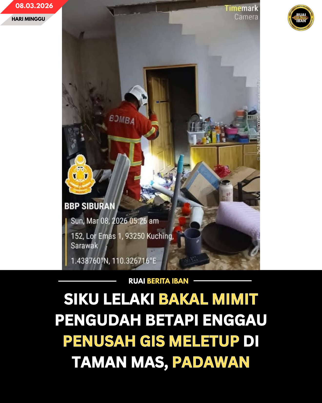 PADAWAN, 8 Mac — Siku lelaki betapi enggau pengirau pengudah nyadi mansa penusah gis meletup enggau angus ke nyadi ba sebuah rumah di Lorong 1, Taman Mas Padawan, ditu, tumu pagi tadi.
