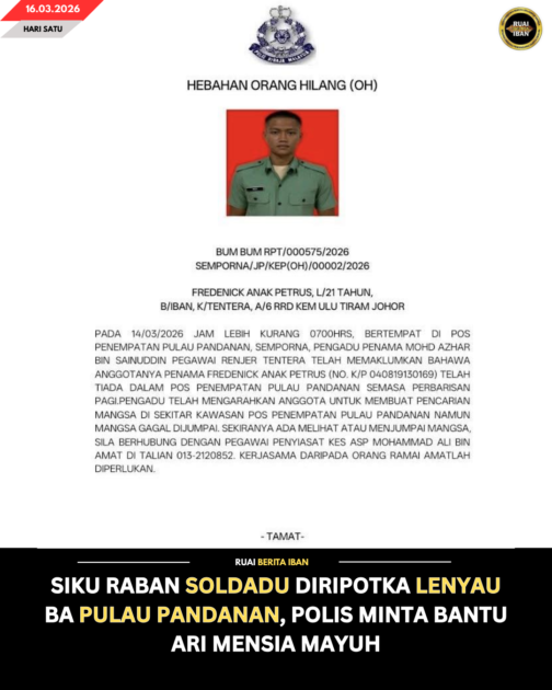 SIKU RABAN SOLDADU DIRIPOTKA LENYAU BA PULAU PANDANAN, POLIS MINTA BANTU ARI MENSIA MAYUH
