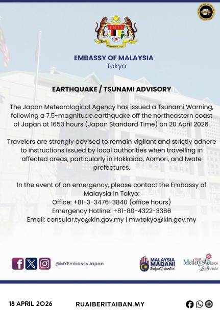 Opis Kedutaan Malaysia di Tokyo nengah siti penerang ngelalau semua rayat Malaysia enggau temuai ngambika seruran bejaga-jaga sereta nitihka penuh atur ari piak bekuasa kandang menua, kelebih agi ba kandang endur ke kena penusah nya.