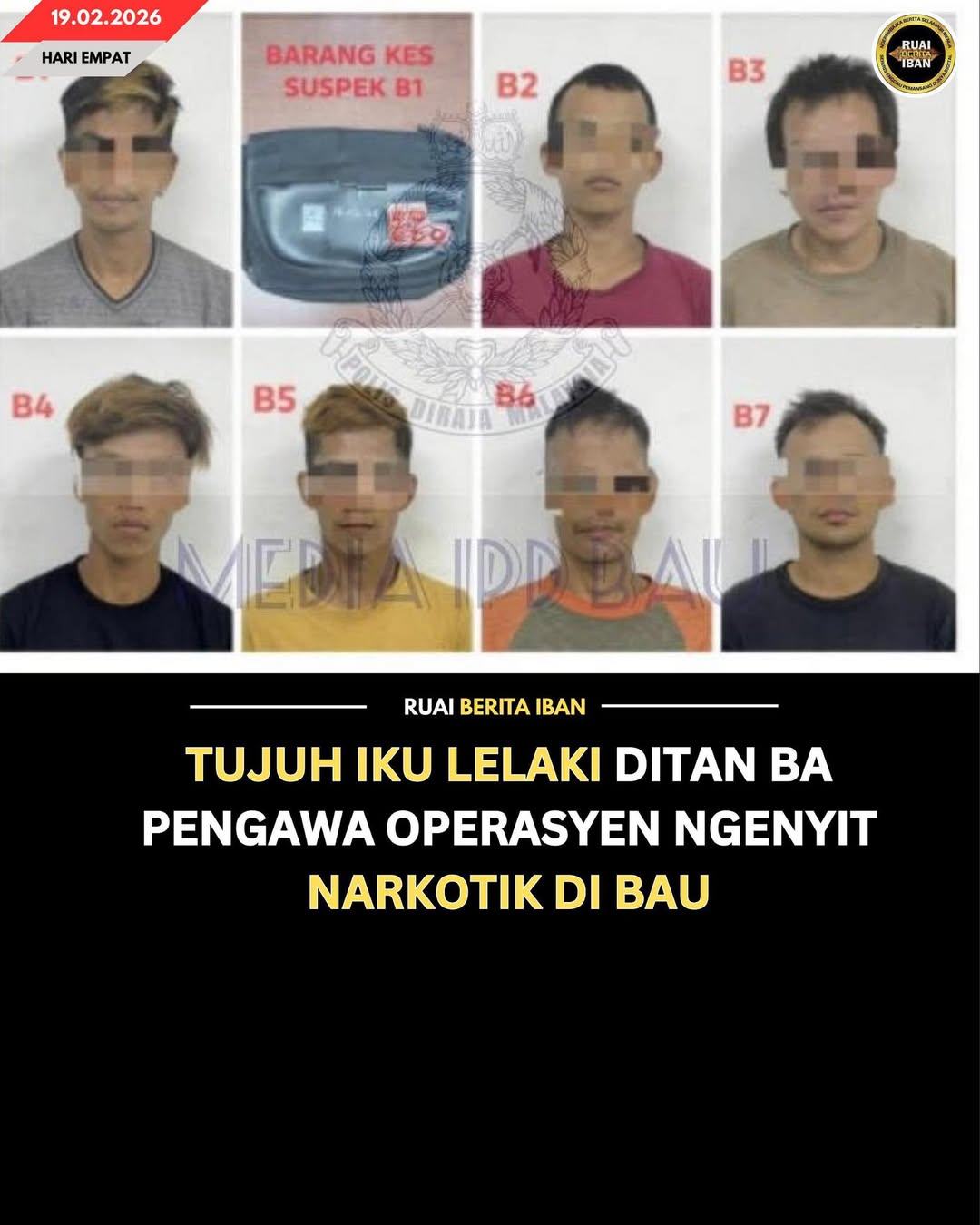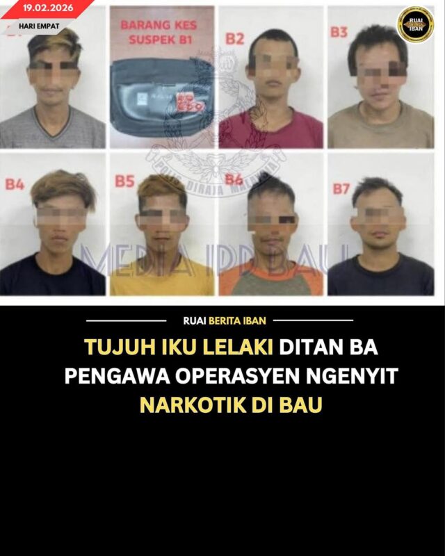BAU, 19 Feb — Polis udah nangkap tujuh iku lelaki peranak menua nya ke beumur entara 22 ngagai 39 taun dalam operasyen ngenyit bekaul enggau pengawa salah guna dadah ngelingi Kampung Serikin tumu pagi tadi.